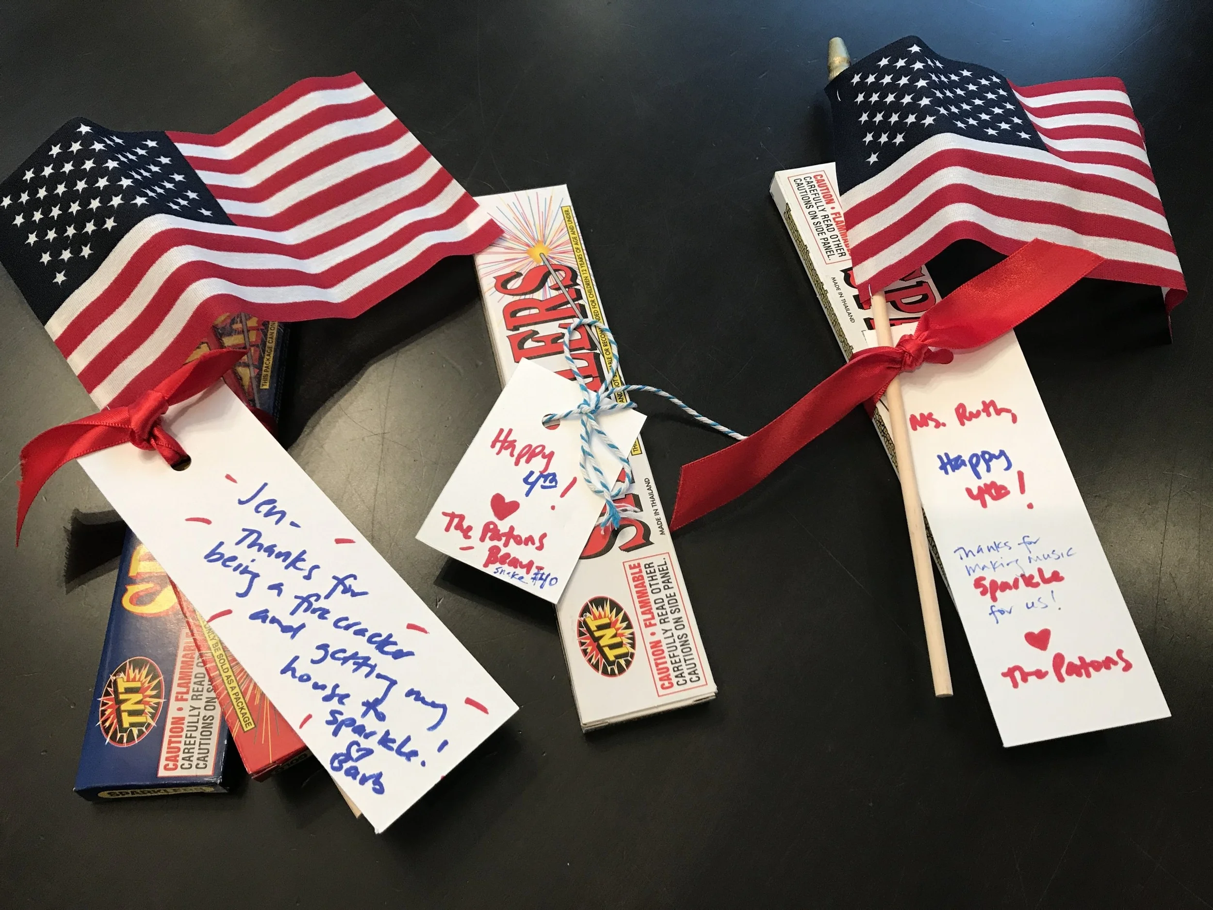 Where I live these days, sparklers are sold everywhere because they are legal in the state of Minnesota. Anything that flies or explodes is considered illegal which means sparklers make the cut. So even though Fourth of July is not really a holiday that many people would give away thoughtful pinches, I like to give boxes of sparklers to those who make me “sparkle”. This year, Kris, my nail technician, Cybele, my hair stylist, Kristin, my esthetician and Jen, my interior designer, all received a box of sparklers and a flag tied up with a bow. I also wanted to be thoughtful of those who “spark” the talents of our kids so hockey coach Tony and Ms.Ruth, our piano teacher, each received a box. Finally, those who keep our home safe, happy and sparkly - Kim, our postal server, Todd, the handyman, and the neighbors who keep watch over our home while we are on vacation received boxes of sparklers too. A pinch of thoughtfulness.