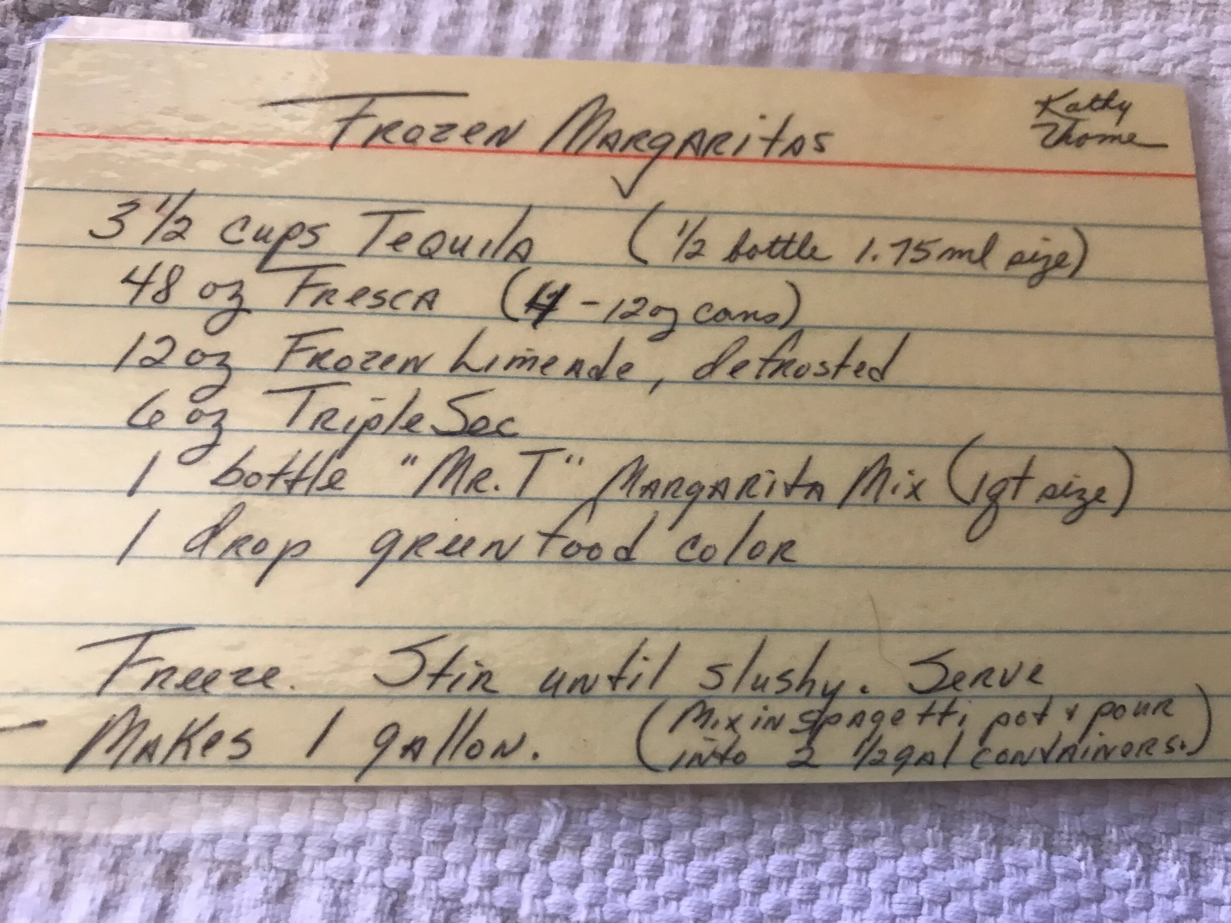 Klaudette, my roommate at the time, was given this recipe from her mom, Star, for our Cinco de Mayo party. As a thoughtful pinch, she shared it with me for this post. This recipe is precious because the card is laminated and the ingredients Fresca and green food color are just the signs of the times. I love this!